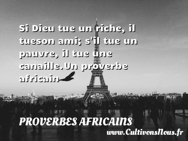 Evaluer cet article Si Dieu tue un riche, il tue son ami; s’il tue un pauvre, il tue une canaille. Un proverbe africain A lire Là où on s'aime, il ne fait jamais nuit PARTAGER