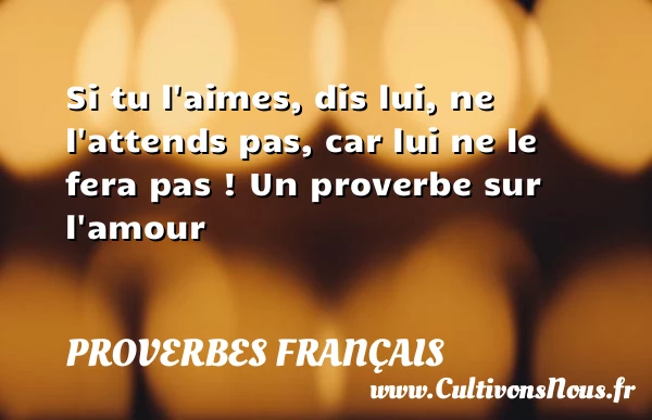 Evaluer cet article Si tu l’aimes, dis lui, ne l’attends pas, car lui ne le fera pas ! Un proverbe sur l’amour A lire Un bon père de famille doit être PARTAGER Tags: Proverbe amour
