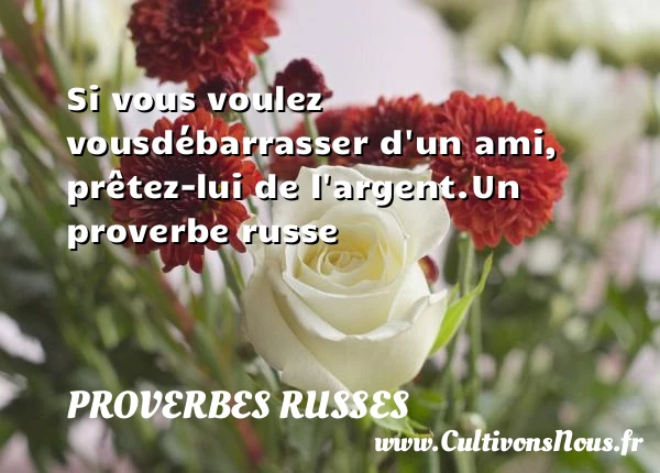 Evaluer cet article Si vous voulez vous débarrasser d’un ami, prêtez-lui de l’argent. Un proverbe russe A lire L'homme est la tête, la PARTAGER