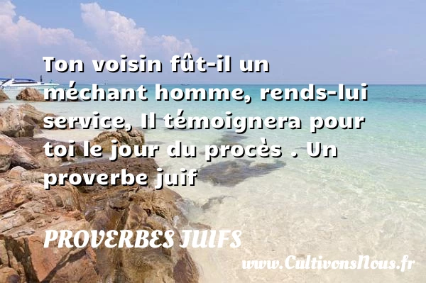 Evaluer cet article Ton voisin fût-il un méchant homme, rends-lui service, Il témoignera pour toi le jour du procès . Un proverbe juif A lire Voulez-vous beaucoup PARTAGER Tags: Proverbes vice