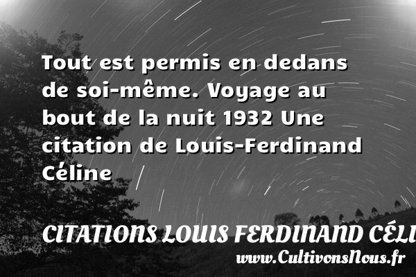 Evaluer cet article Tout est permis en dedans de soi-même. Voyage au bout de la nuit 1932 Une citation de Louis-Ferdinand Céline A lire Quand on n'a pas d'argent à PARTAGER Tags: Citation voyage