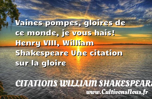 Evaluer cet article Vaines pompes, gloires de ce monde, je vous hais! Henry VIII, William Shakespeare Une citation sur la gloire A lire On n'est pas né pour la gloire, PARTAGER Tags: Citation gloire