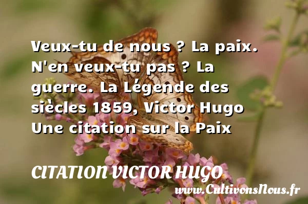 Evaluer cet article Veux-tu de nous ? La paix. N’en veux-tu pas ? La guerre. La Légende des siècles 1859, Victor Hugo Une citation sur la Paix A lire La mystique de la paix, tout PARTAGER Tags: Citation paix